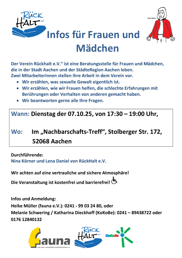 RückHalt – Infos für Frauen und MädchenVon Irene@Fauna / 2. Oktober 2025 Nächste Woche Dienstag (07.10.2025) informiert der Verein Rückhalt e.V. über seine Arbeit im Nachbarschaftstreff der Fauna. Der Eintritt ist gratis und die Räumlichkeiten barrierefrei!